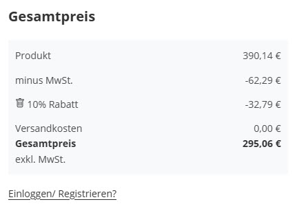 - Rabatte erscheinen direkt bei den Produkten bzw. vor der Versandkosten-Berechnung.